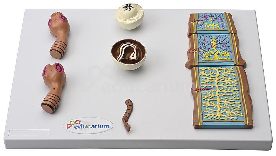 Model przedstawia: jajko, larwę, głowę tasiemca uzbrojonego, głowę tasiemca nieuzbrojonego, ostatnie segmenty pasożyta w rozmiarze zbliżonym do naturalnego oraz jego powiększone części w rożnym stopniu dojrzałości.