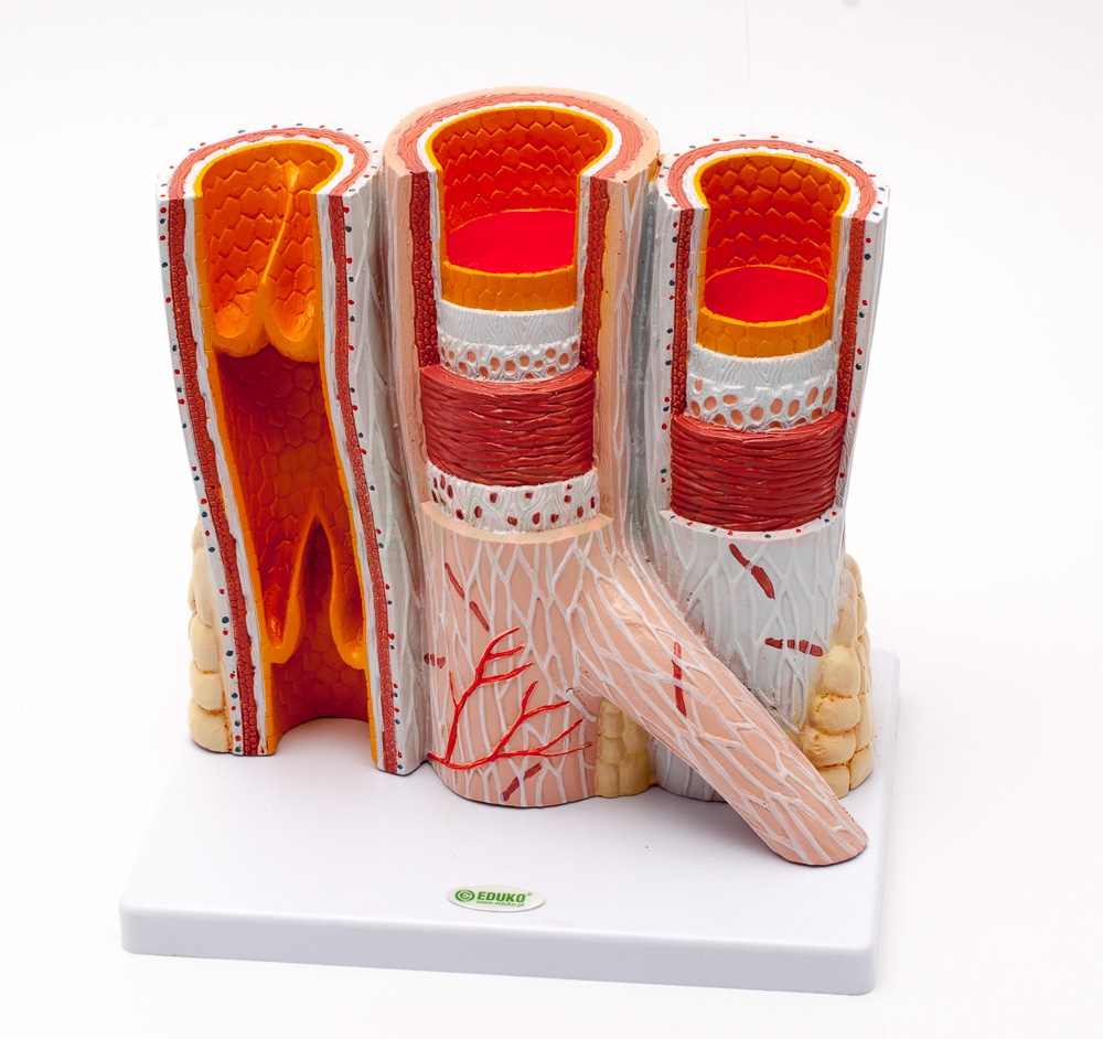 Pomoc dydaktyczna firmy EDUKO doskonale obrazuje budowę tętnicy i żyły z zaznaczeniem wszystkich istotnych różnic w budowie naczyń krwionośnych tych typów. Na tym szczegółowym, dużym modelu wyraźnie widać poszczególne warstwy tkanek i różnice w ich grubości; w świetle żyły widoczne są zastawki. Model trwale umocowany jest na podstawie o wymiarach 27x20cm; wysokość modelu: 27cm.