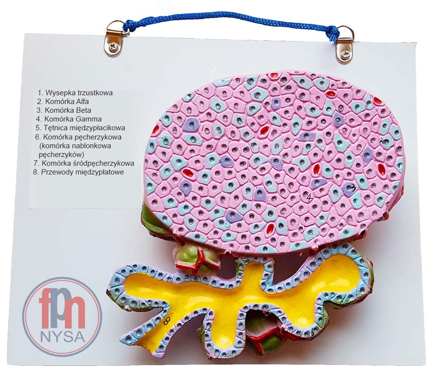 Wysepki trzustkowe odpowiedzialne są za produkcję hormonów i rozsiane są po całej trzustce - największe ich skupisko znajduje się w ogonie trzustki. Wyspa trzustkowa jest jednym z gruczołów wydzielania wewnętrznego. Proponowany model anatomiczny wysepki trzustkowej stanowi jeden z najważniejszych, jakie powinny pojawić się w każdej pracowni biologicznej, ze względu na funkcje jakie pełni. Przedstawiony model wysepki trzustkowej składa się: