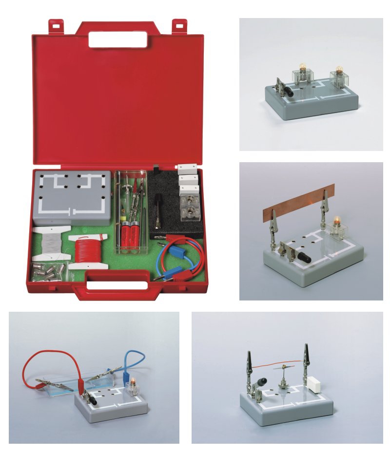 Prosty zestaw niezbędny do nauczania podstaw elektryczności. W jego skład wchodzi 27 elementów, m.in. oprawki żarówek, żarówki, baterie, przewody, zaciski "krokodylkowe", igła magnetyczna, wyłącznik nożowy, podstawka montażowa.