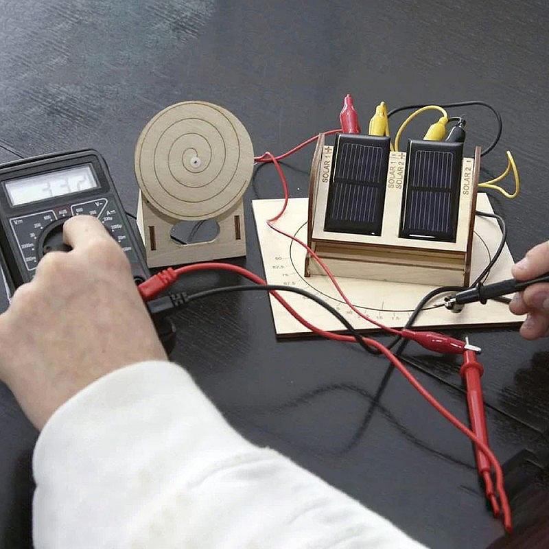 Instrukcja zawierająca informacje i ciekawostki na temat paneli fotowoltaicznych oraz 7 doświadczeń: 1) Różne źródła światła 2) Połączenie szeregowe ogniw słonecznych 3) Połączenie równoległe ogniw słonecznych 4) Częściowe zacienienie ogniw słonecznych w strukturze złożonej 5) Filtry światła i warunki zachmurzenia 6) Zalety systemów śledzących 7) Nachylenie dachu i wpływ na wydajność