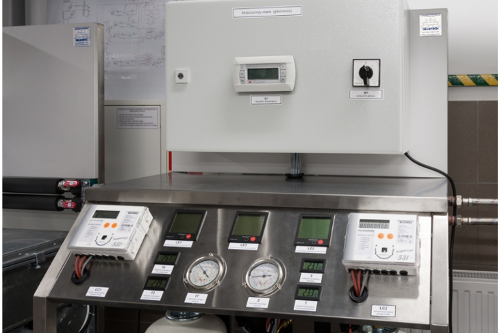 Zestaw wyposażony jest w aparaturę pomiarową tj.: elektroniczne wskaźniki temperatury, manometry, licznik energii elektrycznej oraz w regulator temperatury umożliwiający zmianę parametrów pracy systemu.