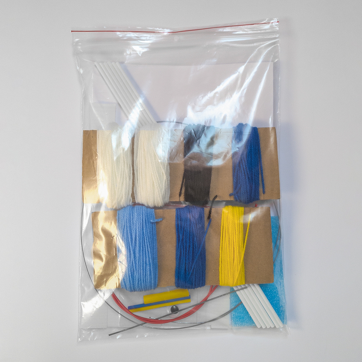 14. Pas kartonowy z nawinięta grubą włóczką koloru żółtego, ciemnoniebieskiego i jasnoniebieskiego