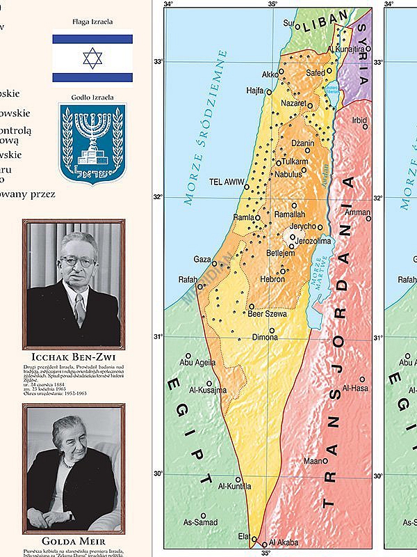 Dodatkowo na mapie widnieje flaga oraz godło Izraela jak również portrety jego pierwszych przywódców.