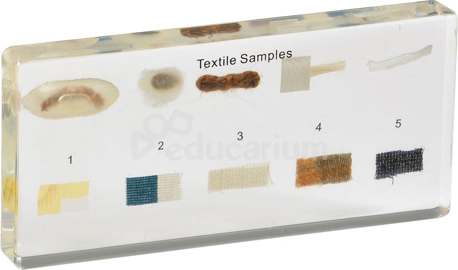 W sztabce akrylu zatopiono 10 elementów, przedstawiających włókna lub przędze i produkowane z nich tkaniny.