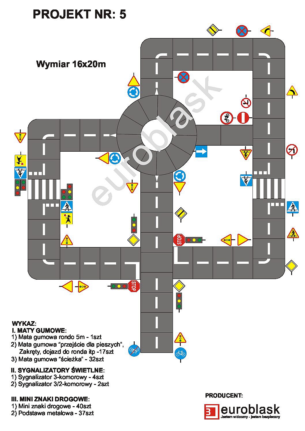 Mobilne miasteczko ruchu drogowego – 16 x 20 m – projekt nr 5 zawiera: