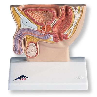 Przekrój środkowy miednicy przez męskie narządy płciowe przedstawia szczegółowo wszystkie elementy budowy anatomicznej.