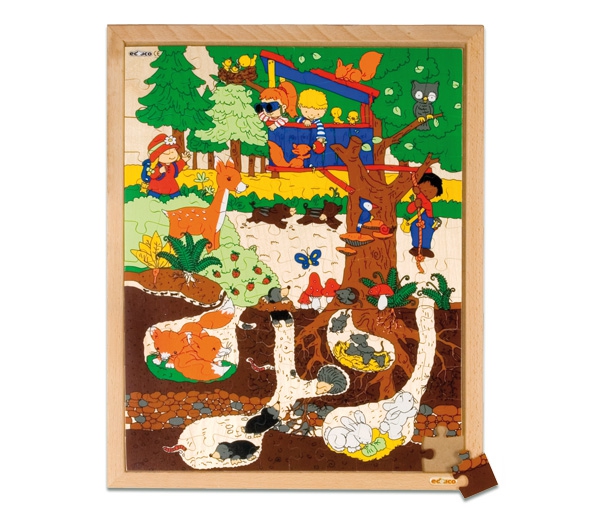 Wspaniałe puzzle z grubej sklejki ukazują dzieciom las w nowej odsłonie. Pokazują, to, co zawsze można zobaczyć w czasie wędrówki po lesie, ale nie tylko. Dolna połowa układanki ukazuje to, co dzieje się pod ziemią: korzenie roślin, korytarze i nory zwierząt, warstwy gruntu. Puzzle zapewniają doskonały materiał obrazkowy do przyrodniczych rozmów z dziećmi. A także dużo frajdy podczas układania.