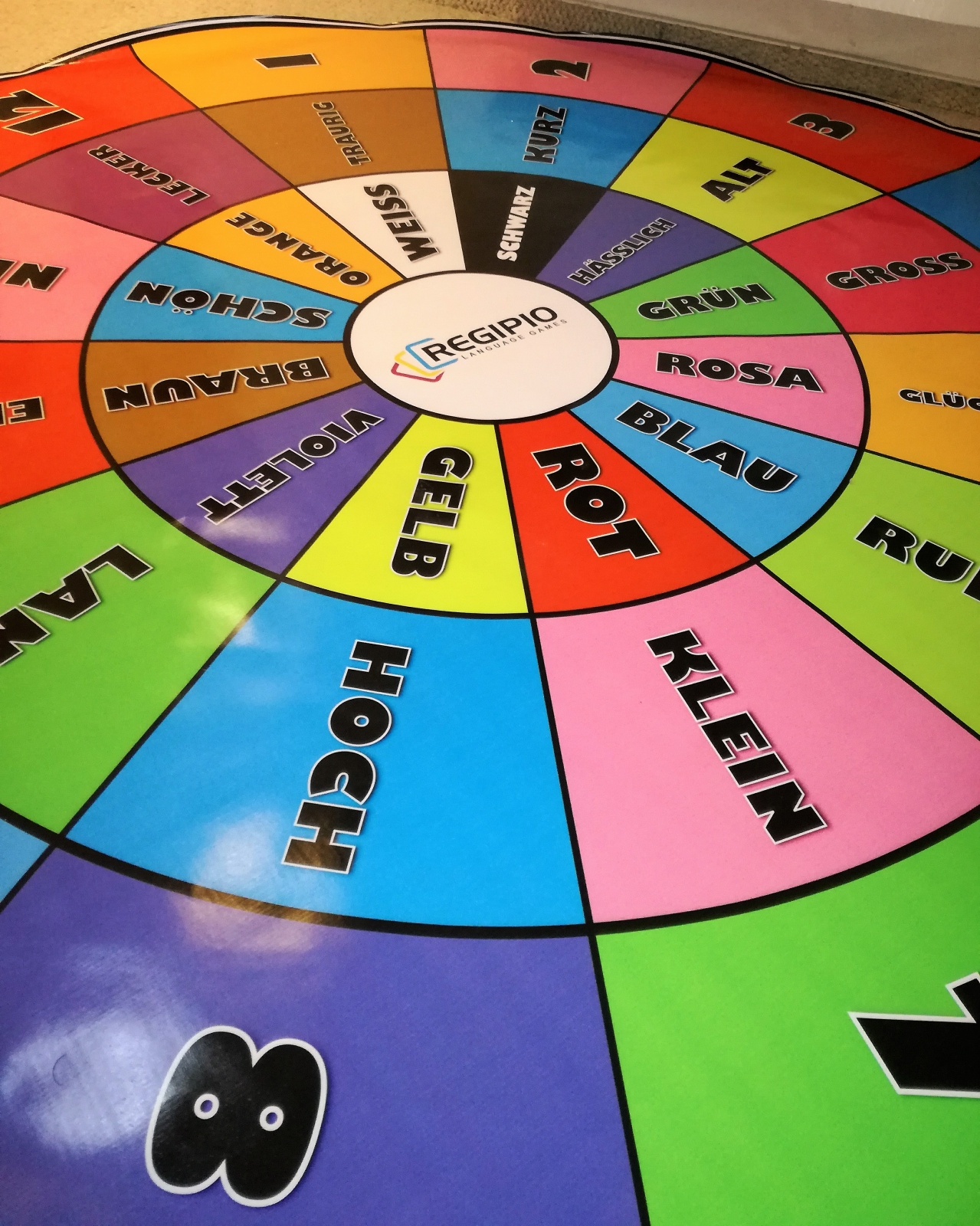 Gry i zabawy rozrywane są na podzielonej na 36 kolorowych pól okrągłej planszy o średnicy 2m. Do gry dołaczona jest instrukcja z propozycjami zabaw.