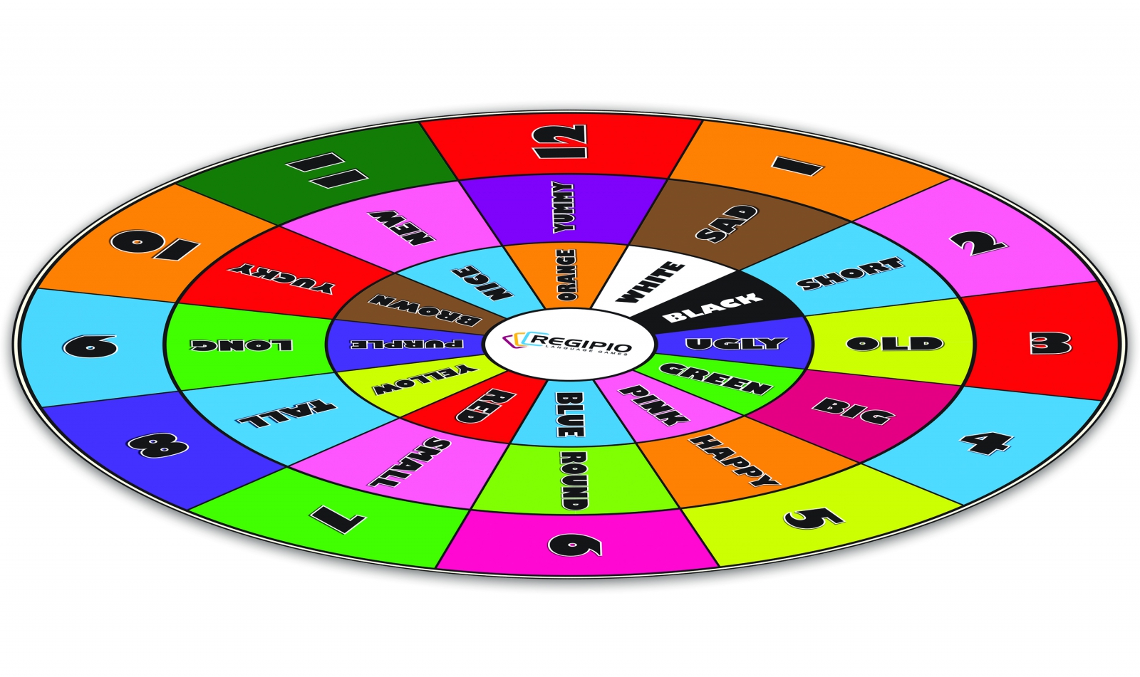 Gracze bawią się na kolorowej planszy jednocześnie używając przymiotników opisujących kolor lub cechę. Liczą również do 12. Podczas wspólnej zabawy uczą się dodatkowo współpracy i wzajemnej pomocy.