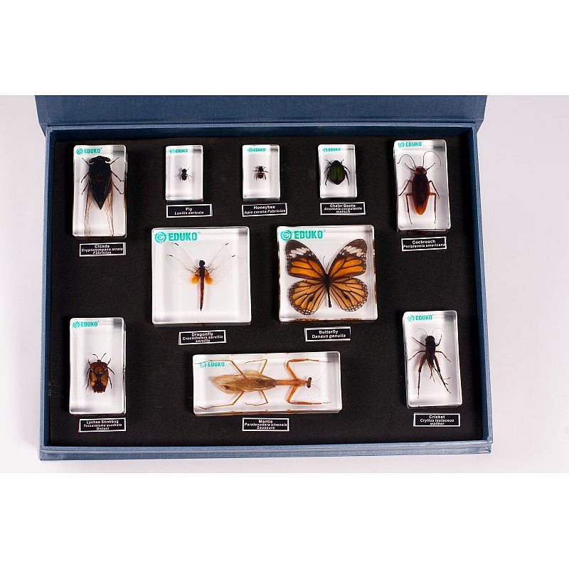 Zestaw zawiera 10 okazów owadów zatopionych w pleksi: