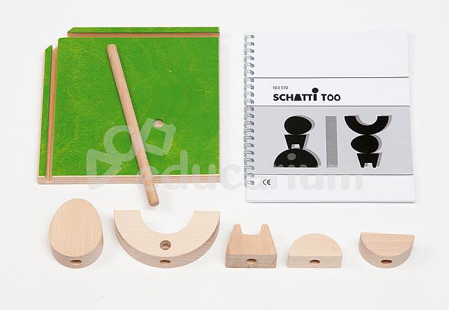 Rodzina nakładanek cieni powiększyła się. Schatti Too jest większym bratem popularnej nakładanki Schatti - zawiera 5 elementów do układania. Eksperymentując z nowymi kształtami dzieci odtwarzając z klocków cienie przedstawione na karcie. Także w tej grze wielkość cienia jest zgodna z wielkością klocków, aby umożliwić dzieciom sprawdzenie ułożenia jeden do jednego.