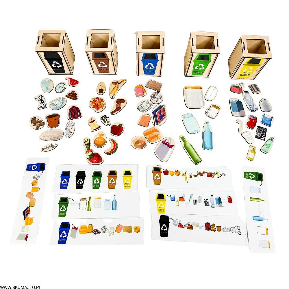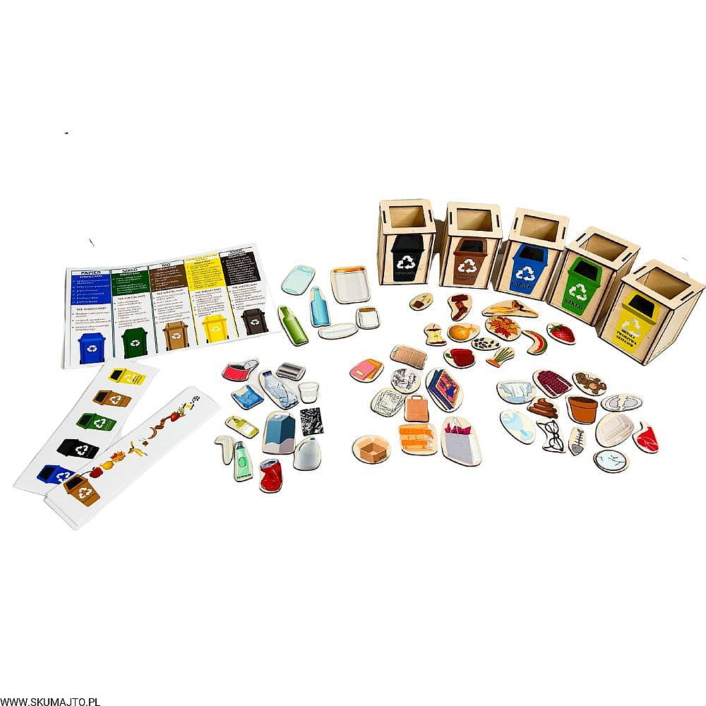 - Odwzorowywanie: Za pomocą dołączonych kart dziecko odwzorowuje kolejność koszy i segreguje odpady.