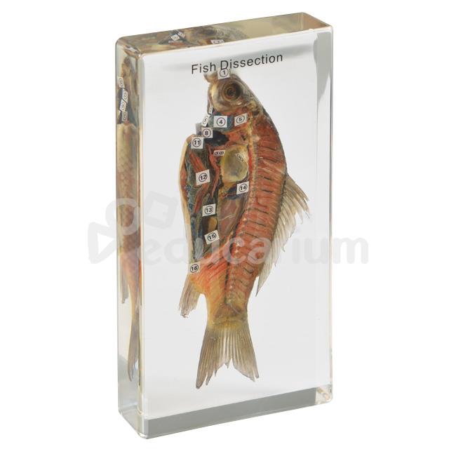 Naturalnych rozmiarów ryba po sekcji anatomicznej zatopiona w sztabce akrylu.
