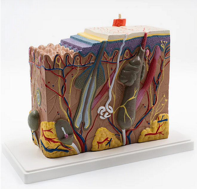 Szczegółowość i trójwymiarowe ujęcie: Dzięki precyzyjnemu wykonaniu oraz trójwymiarowemu ujęciu przekroju, model doskonale prezentuje warstwową budowę skóry, uwzględniając naskórek, skórę właściwą, tkankę podskórną oraz liczne wytwory skóry, takie jak włosy, gruczoły łojowe, potowe, receptory, nerwy oraz naczynia krwionośne.