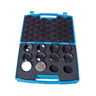 Po jednej soczewce: +50mm, +100mm, +200mm, +500mm, -100mm, -150mm, -200mm, -500mm, 1 zwierciadło płaskie, 1 zwierciadło wypukłe -200mm, po jednej przesłonie z otworem 1mm, 2mm, 5mm, 10mm, 1 przesłona z jedną szczeliną i 1 przesłona z trzema szczelinami, 1 przesłona z wyciętą cyfrą "1" i 1 przesłona z wyciętą literą "D". Zestaw dostarczany w walizce z tworzywa sztucznego z wkładem piankowym.