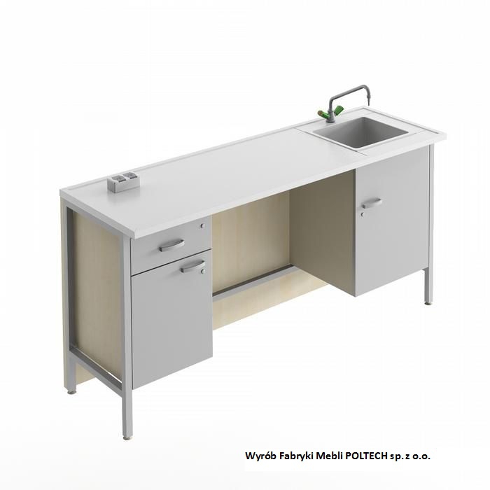 laminatu z obrzeżem z malowanego proszkowo kątownika aluminiowego, - nadstawką elektryczna 2x230V, - zlew nakładany ze stali nierdzewnej z baterią c.z. woda -osłona czołowa z płyty melaminowanej – szafka podwieszana „600” z drzwiczkami i szufladą i „500” zlewozmywakowa; uchwyty – łuk płaski dł 128 mm