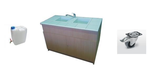 Stolik laboratoryjny wykonany na konstrukcji płyta wiórowej laminowanej 18mm, wyposażony w blat pokryty płytkami ceramicznymi, 2 duże zlewy, zawór wodny, drzwiczki. Stolik dostępny w kolorach biały, popiel, buk. Dodatkowe kolory na specjalne zamówienie. Stolik posiada w wyposażeniu dwa zbiorniki na wodę z kranikiem 20l każdy, pompe wodną 24V, kółka obrotowe z hamulcem.