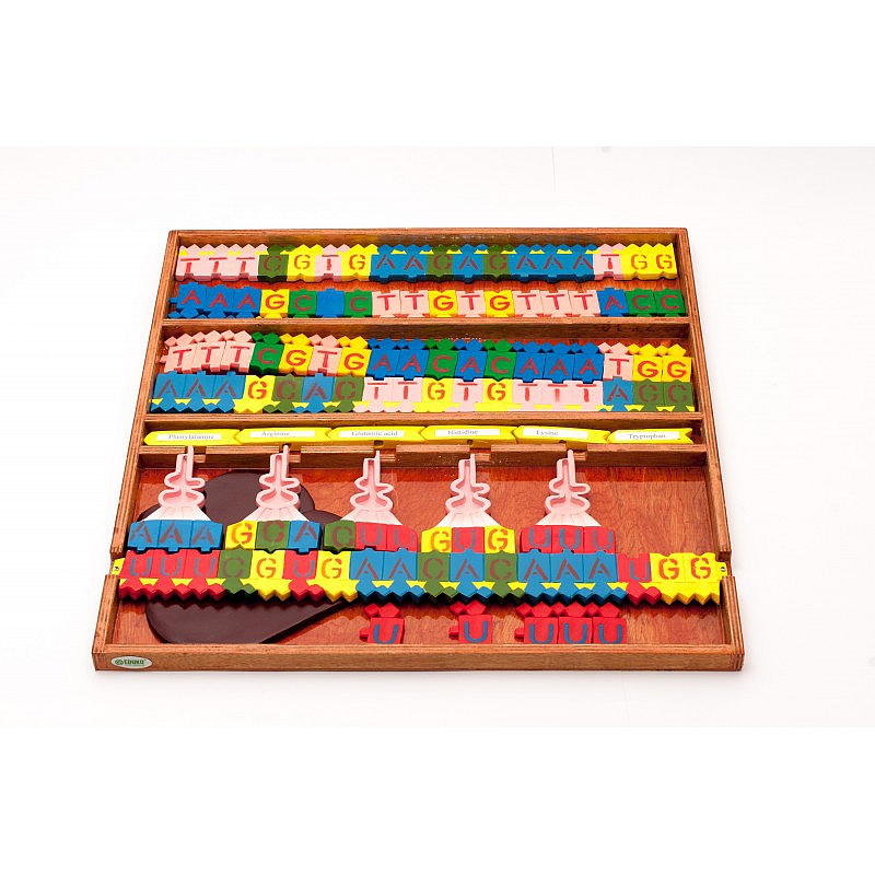 Ten duży model funkcjonalny pomaga przybliżyć uczniom procesy replikacji, transkrypcji i translacji DNA. Dzięki przystępnej formie klocków uczniowie będą mieli okazję samodzielnie zgłębiać podstawowe prawa ekspresji informacji genetycznej. Model przybliży m.in. reguły łączenia się par zasad azotowych w DNA i RNA oraz kolejne kroki na drodze syntezy białek. W dwóch górnych częściach trójdzielnego pudełka znajdują się komplementarne matryce odzwierciedlające rozpleciony na dwie osobne nici fragment DNA podlegający replikacji oraz komplety klocków, z których uczniowie mogą własnoręcznie układać nową, dopiero syntetyzowaną nić. W dolnej części modelu uczniowie odtwarzają proces translacji w oparciu o mRNA- kopię informacji genetycznej zapisanej w formie sekwencji zasad azotowych we fragmencie DNA z górnej części pudełka. Klocki odzwierciedlające kodony i aminokwasy układane w odpowiedniej sekwencji tworzą nowe białko. Wielkość całego modelu ograniczona jest trójdzielnym pudełkiem wykonanym ze sklejki wymiarach: 60x56x2,5cm
