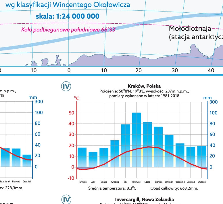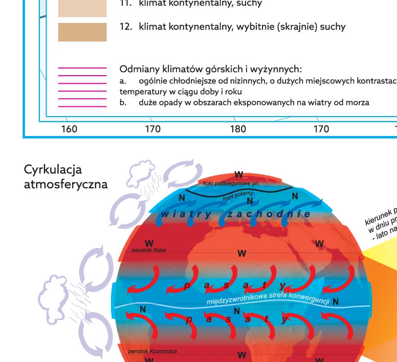 Mapa ścienna „Świat – strefy klimatyczne” w skali 1:24 000 000 pokazuje rozmieszczenie pięciu głównych stref klimatycznych. Idealnie więc sprawdzi się w roli edukacyjnej. Eksponuje wszystkie charakterystyczne dla stref klimatycznych elementy, takie jak temperatura powietrza, opady czy ciśnienie atmosferyczne. To niezastąpione narzędzie dla wszystkich tych, którzy chcą zrozumieć te niezwykle ważne aspekty dla prawidłowego funkcjonowania całej naszej planety.