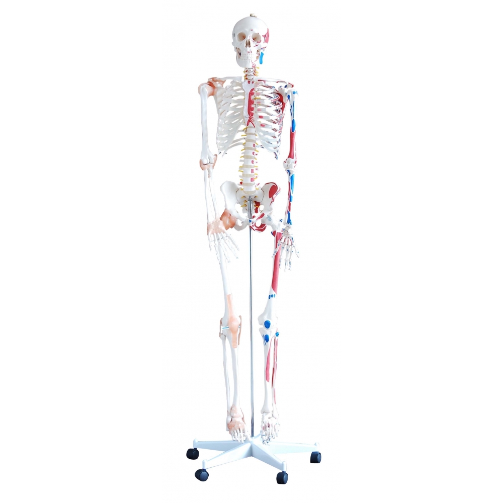 Szkielet zawiera rozgałęzienia nerwowe, tętnice kręgową oraz dysk lędźwiowy. Czaszka zawiera ruchomą szczękę, linie szwowe, ścięte sklepienie oraz 3 wymienne dolne zęby. Szkielet jest zamontowany na metalowym statywie 16''. Wykonany jest z łatwego do umycia oraz niełamliwego plastiku PVC.