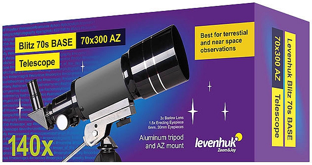 Teleskop Levenhuk Blitz 70s BASE to refraktor o krótkiej ogniskowej montowany na stołowym statywie. Przyrząd doskonale sprawdza się w małym mieszkaniu lub na wycieczce. Ma bardzo niewielki rozmiar. Obsługa tego modelu jest niezwykle łatwa, a zestaw zawiera wszystkie niezbędne akcesoria. Teleskop jest idealny do obserwacji Księżyca, planet Układu Słonecznego i obiektów naziemnych. Można również obserwować jasne obiekty głębokiego nieba, ale wówczas szczegóły nie będą widoczne.