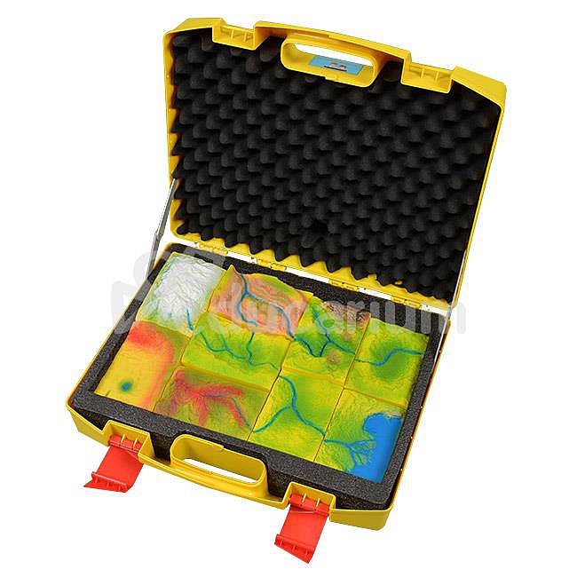 Zestaw pozwoli zapoznać się ze zróżnicowaną topografią terenu. W plastikowej walizce znajduje się 9 modeli przedstawiających: kanion, góry, rzeźbę wiatrową, krajobraz wysokogórski, równinę, wyżynę, dorzecze, ujście deltowe oraz rzeźbę krasową. Pomoc świetnie sprawdzi się podczas lekcji geografii. Do zestawu dołączonych jest 60 kart o wym. 9 x 13 cm ze zdjęciami różnych form ukształtowania terenu.