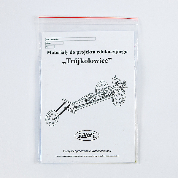 Materiały do realizacji projektu edukacyjnego „Trójkołowiec” spakowane są w woreczku strunowym. Za dodatkową opłatą można zakupić specjalne kartonowe segregatory, które umożliwiają wygodne przechowywanie woreczków z materiałami np. na półce.