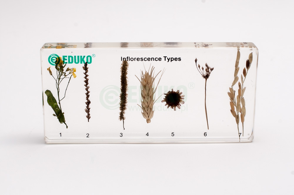 Preparat firmy EDUKO zawiera 7 kwiatostanów zatopionych w pleksi: grono, kłos, kotka (odmiana kłosa), kłos złożony, główka, baldachogrono, wiecha złożona. Jest to doskonała pomoc edukacyjna dla klas przyrodniczych i biologicznych, która umożliwia zapoznanie ucznia z wybranymi rodzajami kwiatostanów groniastych. Przejrzyste tworzywo, w których zalane zostały organy pozwala na wnikliwą obserwację, jest bezpieczne dla ucznia i zwiększa trwałość preparatu.