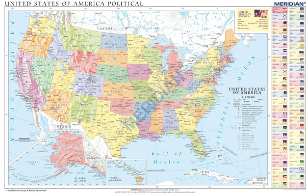 Ścienna, geograficzna mapa szkolna przedstawiająca podział administracyjny USA. Oprócz klasycznej zawartości mapy administracyjnej, czyli podziału na stany zawiera ona wiele ciekawych i przydatnych dydaktycznie informacji, takich jak: