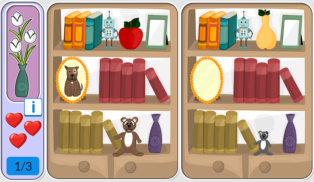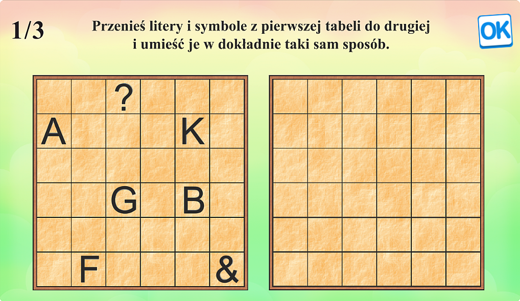 Dwa poziomy trudności: Poziom 1 – przeznaczony dla dzieci w wieku przedszkolnym, nieznających jeszcze liter i cyfr; ćwiczenia wspierają koncentrację, pamięć i rozwój poznawczy poprzez zabawę. Poziom 2 – dla dzieci w zerówce, które rozpoznają już litery i cyfry; ćwiczenia rozwijają precyzję, logiczne myślenie oraz gotowość szkolną.