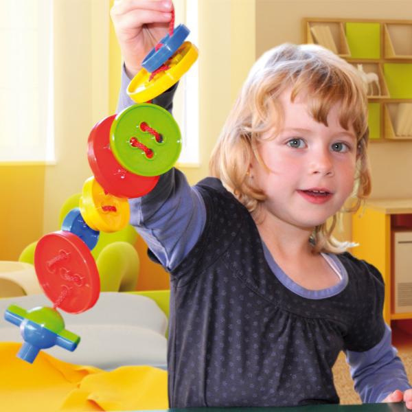 Wyjątkowo duże guziki do zabaw w nawlekanie i sortowanie. Wystające obrzeża guzików oraz otworów ułatwiają trzymanie i nawlekanie. Dodatkowym atutem guzików jest ich zmienna średnica, co zmienia stopień trudności ćwiczeń manualnych, a także może stanowić kryterium sortowania.