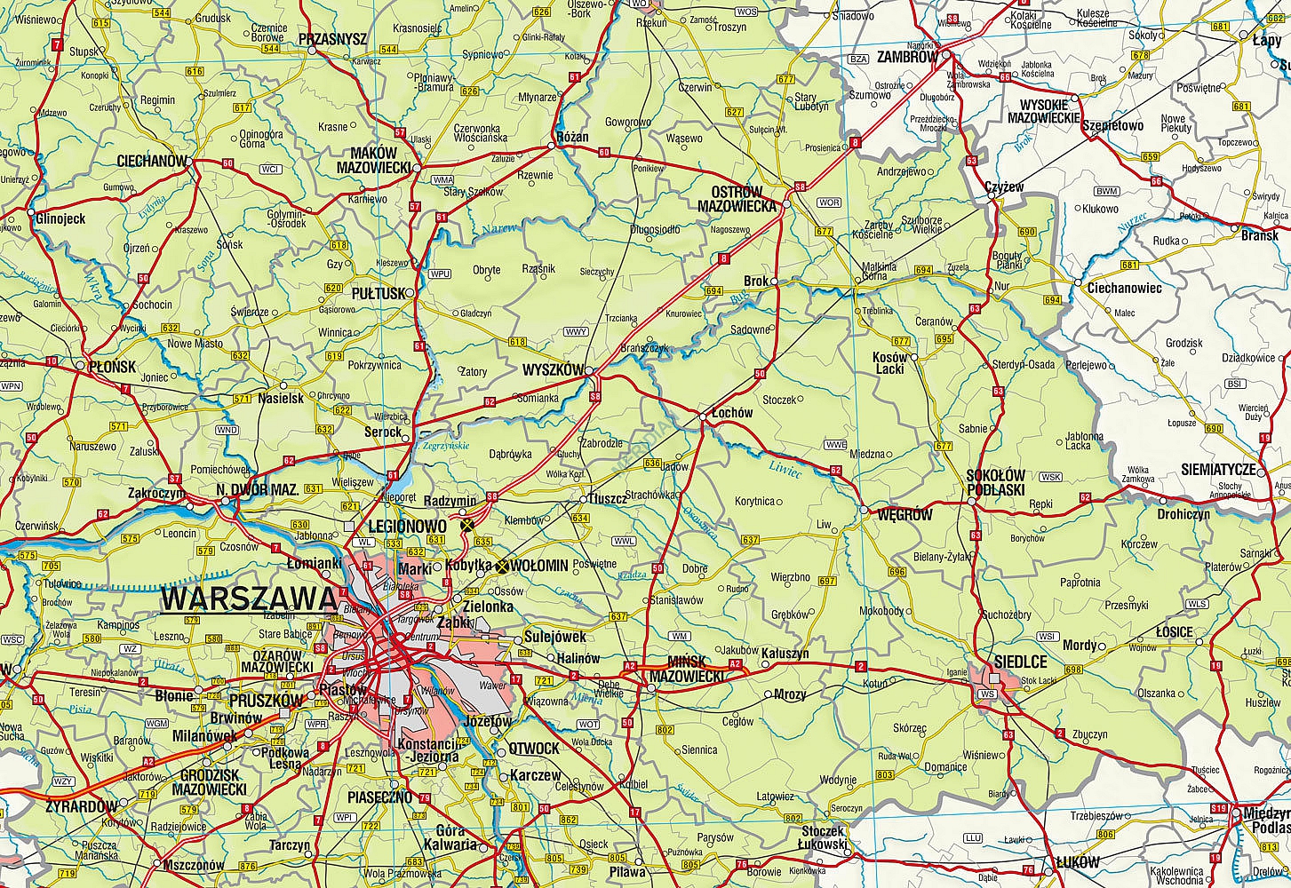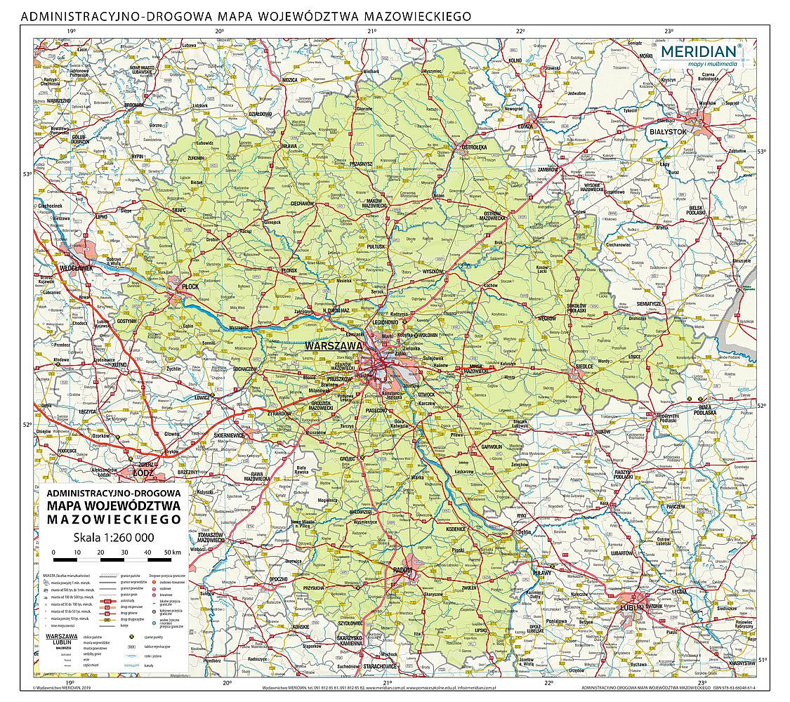 Ścienna mapa przedstawiająca administracyjny podział województwa mazowieckiego wraz z uwzględnieniem aktualnej sieci dróg i autostrad oraz kolei. Oprócz trójstopniowego podziału administracyjnego i sieci transportowej, na mapie znajdują się oznaczenia tablic rejestracyjnych, zaznaczono także szczególnie niebezpieczne miejsca na drogach, tzw. "czarne punkty".
