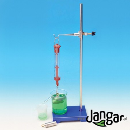 Pomoc w sposób jasny i poglądowy objaśnia prawo Archimedesa. Składa się ze statywu z ruchomym wieszakiem, na którym zawieszamy siłomierz, szklanej zlewki z rurką odprowadzającą skierowaną pionowo w dół, zlewki-odbieralnika oraz dwóch ciężarków – o kształcie regularnym i nieregularnym.