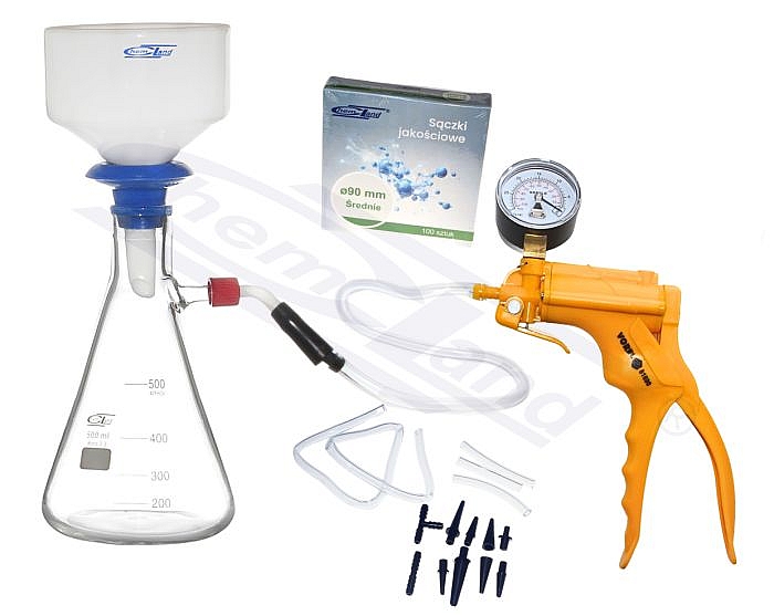 - Ręczna pompka podciśnieniowa: pozwala wytworzyć podciśnienie o wartości -1bar. Zestaw zawiera 17 elementów.
