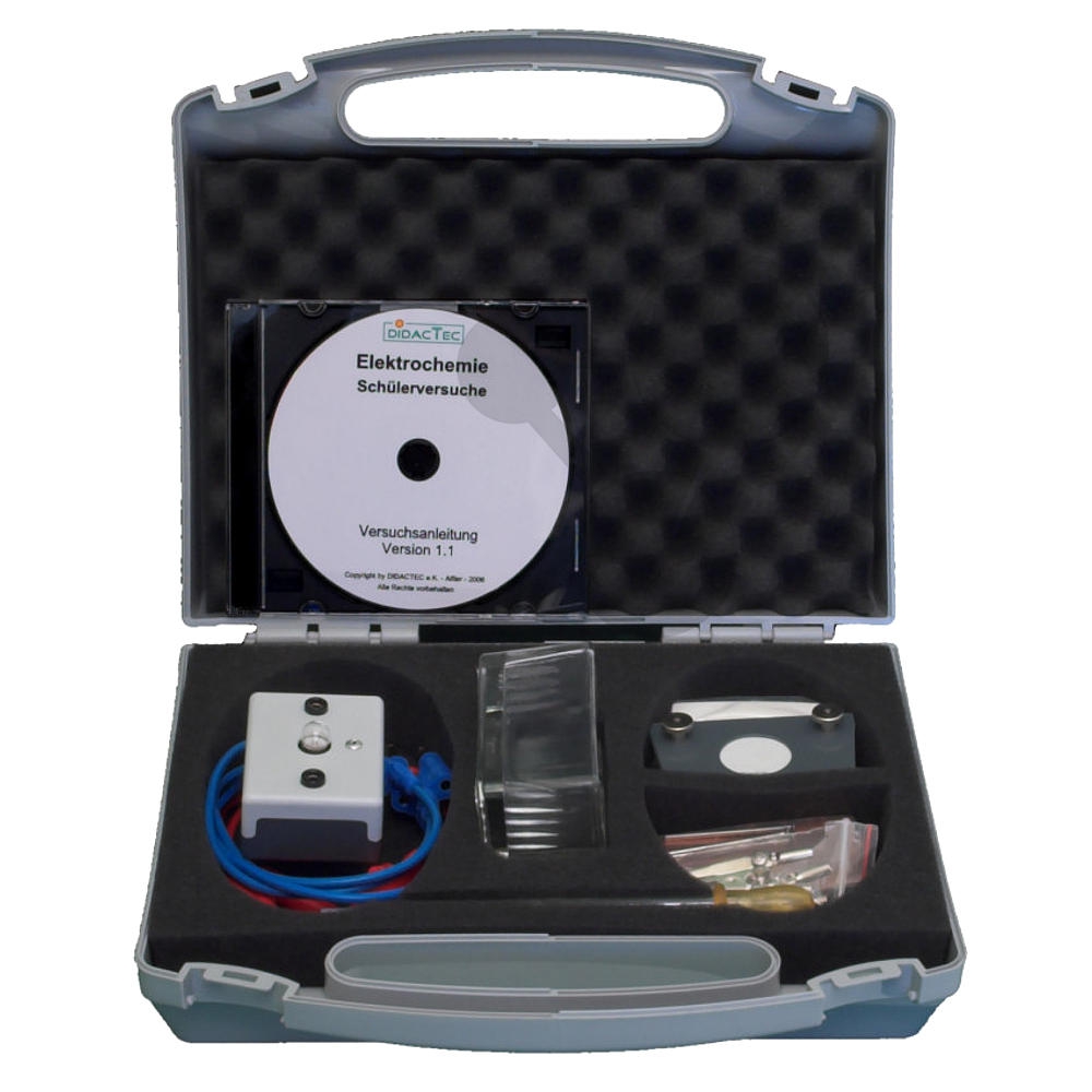 Szkolny zestaw do doświadczeń zawiera podstawowe wyposażenie do wstępnych doświadczeń elektrochemicznych, umieszczone w praktycznej walizce. Kluczowym elementem jest naczynie szklane z różnymi elektrodami, w którym można przeprowadzać doświadczenia dotyczące przewodnictwa, wędrówki jonów, elektrolizy, galwanizacji itp. Diafragma z sączka laboratoryjnego, napięta na ramie z tworzywa sztucznego, w połączeniu z taśmą uszczelniającą umożliwia budowę prostego ogniwa galwanicznego, składającego się z dwóch półogniw. W walizce można przechowywać również inne urządzenia, na przykład ręczny multimetr i silniczek. Do zestawu dołączony jest na płycie CD szczegółowy opis doświadczeń z informacjami dla nauczyciela i arkuszami pracy dla uczniów.