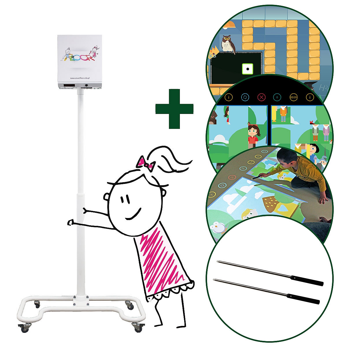 SmartFloor Games to interaktywny zestaw, zawierający niezwykłą podłogę interaktywną SmartFloor z matą oraz statyw mobilny, pozwalający na jej bezproblemowe przemieszczanie w dowolne miejsce. Statyw umożliwia wyświetlenie obrazu wszędzie tam, gdzie nie ma możliwości zamontowania projektora - w centralnym miejscu sali gimnastycznej, na środku klasy czy świetlicy szkolnej.