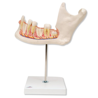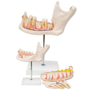 Model prezentuje połowę lewej dolnej szczęki osoby młodej. Jedna sekcja kości po odsłonięciu przedstawia zęby z korzeniami, naczynia i nerwy. Kieł i pierwszy ząb trzonowy jest usuwalny i wzdłużnie dzielony na dwie części. Model jest na statywie